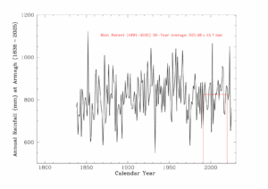 Total precipitation for the month was 71.8 mm, including four trace values, or 71.6 mm when trace values are excluded. This was approximately 92% of the 183-year long-term December average at Armagh and 88% of the most recent 30-year average, confirming that December 2025 was drier than average.