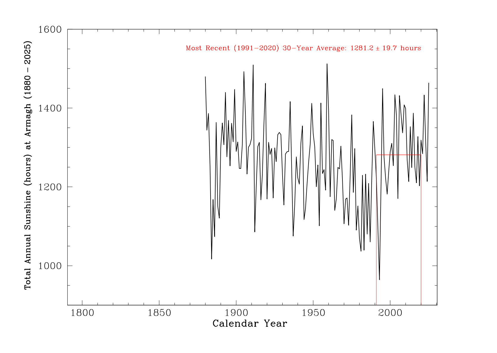 Annual sunshine totalled 1,464.1 hours, around 16% above the long-term average and 14% above the most recent 30-year average. This made 2025 the fourth sunniest year on record at Armagh. The five sunniest years are 1959, 1911, 1905, 2025, and 1919.